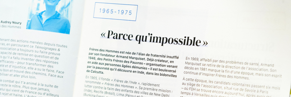 En 1965, bouleversé par l’extrême pauvreté en Inde, Armand Marquiset crée Frères de l’Inde. Très vite, souhaitant élargir son soutien dans le monde, l’association prend le nom de Frères des Hommes. Sa devise ? Parce qu’impossible . Dès les débuts, des volontaires se rendent en Inde, au Pérou et au Burkina Faso pour vivre avec les populations et lutter contre la faim. Peu à peu, les missions s’élargissent à la santé, à l’éducation et au développement rural. Depuis, l’association a traversé les époques et les défis : des premiers volontaires partis dans le "tiers monde", à la naissance des partenariats avec des organisations locales ; des mobilisations citoyennes en France aux projets de formation pour transformer les sociétés aux côtés de nos partenaires.
