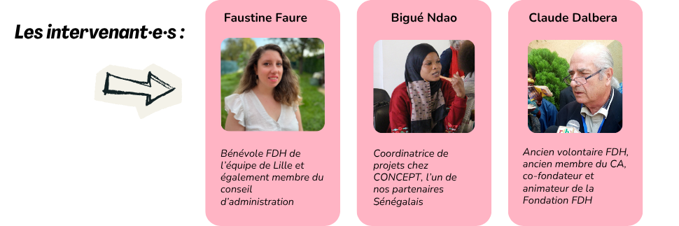 À l’occasion de cette table ronde, nous avons pu croiser des témoignages illustrant différentes formes d’engagement. Faustine Faure, bénévole à Lille, a partagé son expérience de l’engagement associatif en France ; Bigué Ndao, de l’équipe de CONCEPT, l’un de nos partenaires au Sénégal, est revenue sur la dimension partenariale de l’engagement ; enfin, Claude Dalbera, ancien volontaire et ancien membre du conseil d’administration, a évoqué un parcours riche et pluriel, marqué par les débuts de FDH. Un grand merci à toutes et tous pour ces échanges inspirants, ainsi qu’à Luc, membre du conseil d’administration, pour l’animation de la discussion.