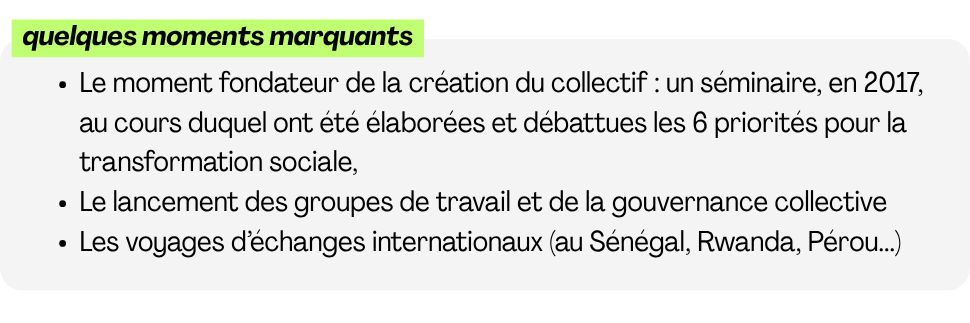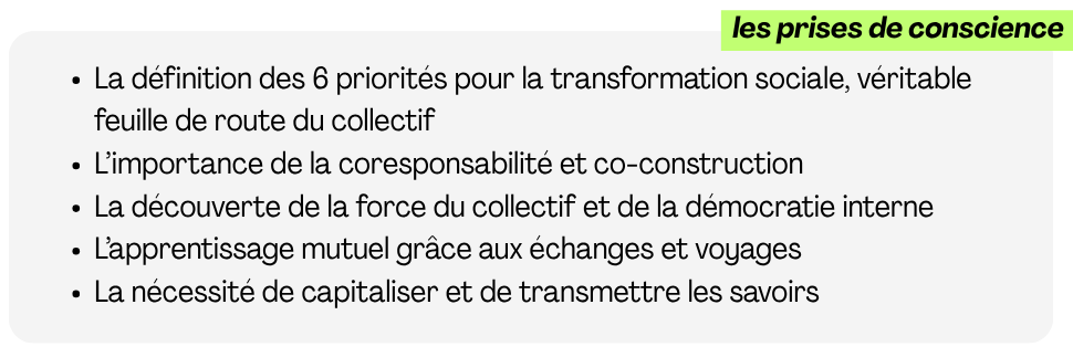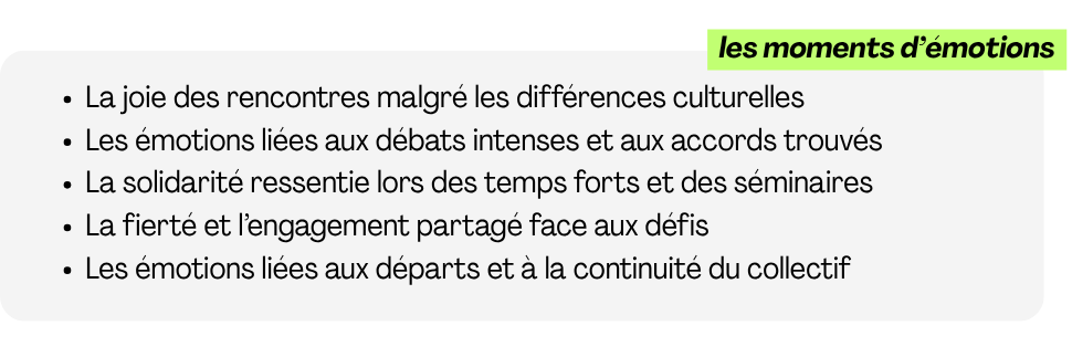 Pour mieux se connaître, chaque membre est revenu sur les temps forts du collectif en partageant ses moments de prise de conscience, les événements marquants, et ses moments d’émotions fortes.